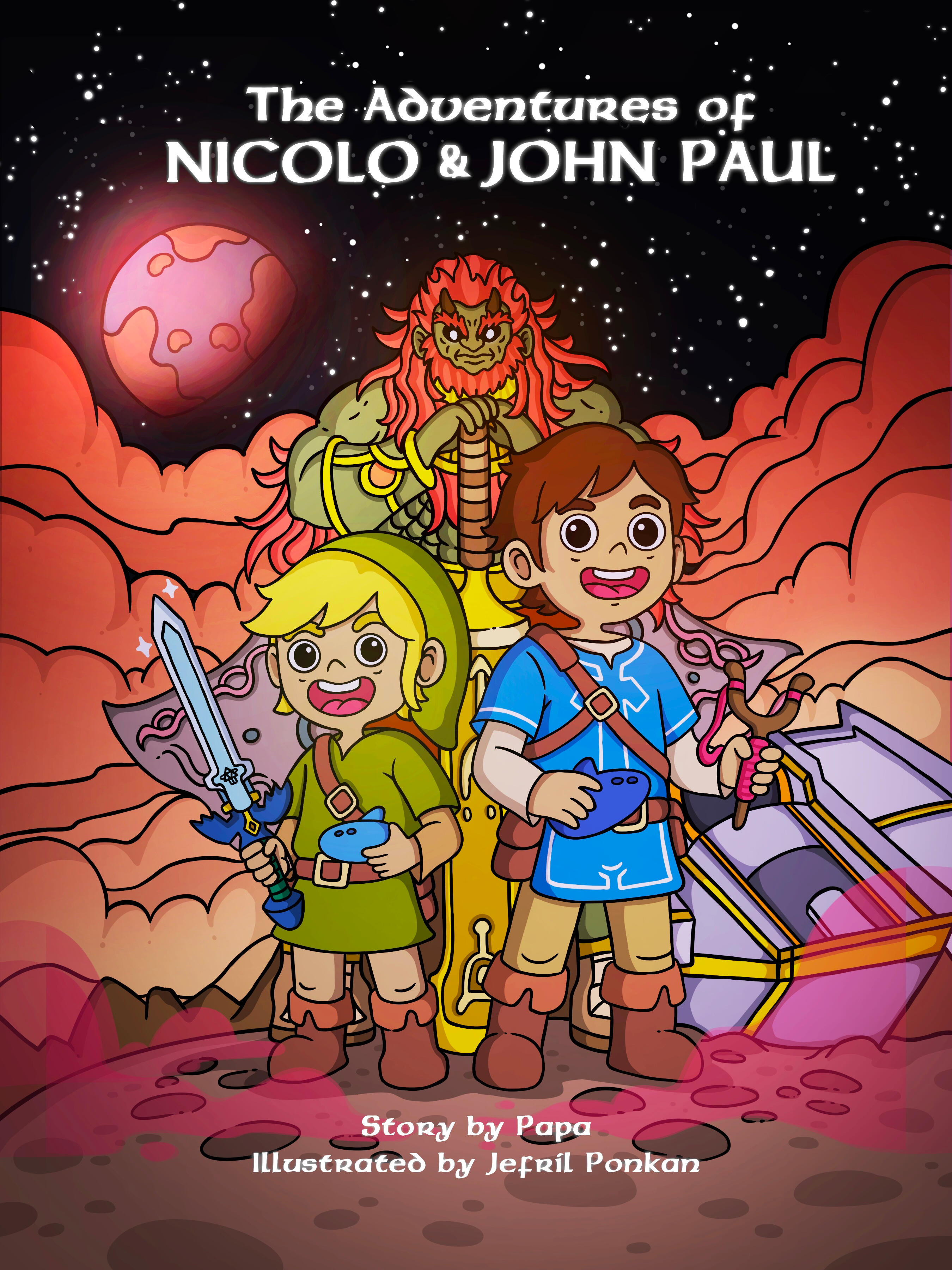 The Adventures of Nicolo and John Paul is a custom story book created for Alfredo, bringing his boys’ imaginations to life.Illustrated by Jef Ponkan, the tale follows brothers Nicolo and John Paul on an epic, Zelda-inspired journey. With courage, teamwork, and the help of their adventurous uncle, the boys set out to face a powerful foe - Ganondorf and protect their world from darkness. Filled with action, heart, and heroic fun, this personalized adventure celebrates family, bravery, and the magic of exploring new worlds together.